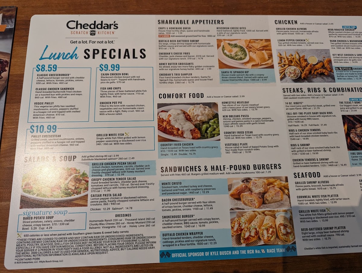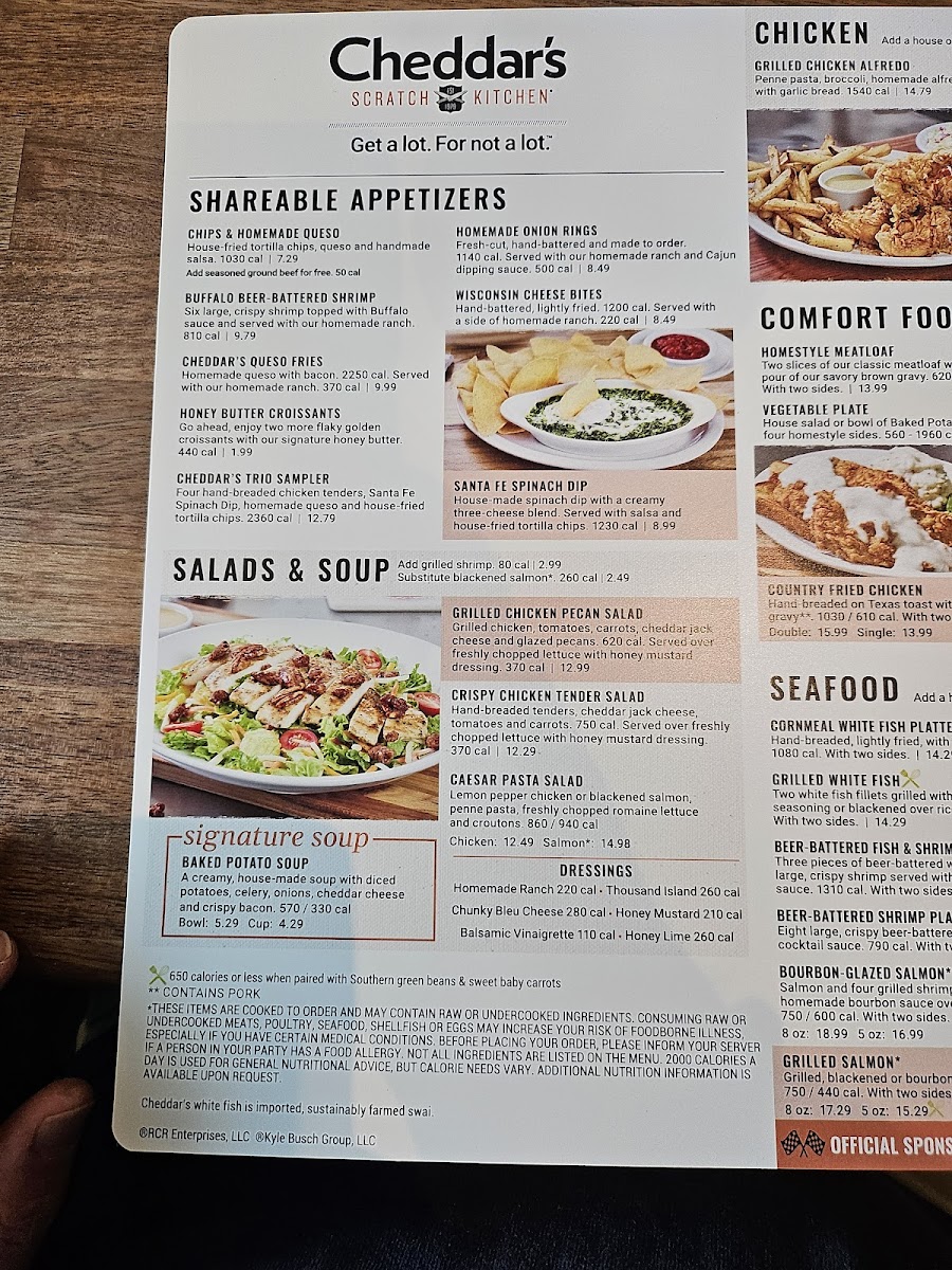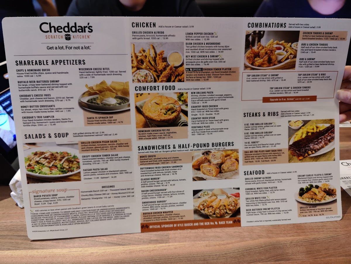 Choose three homestyle appetizers. Chips & Homemade Queso, Santa Fe Spinach Dip, Hand-Breaded Chicken Tenders, Wisconsin Cheese Bites or Cheddar's Queso Fries.