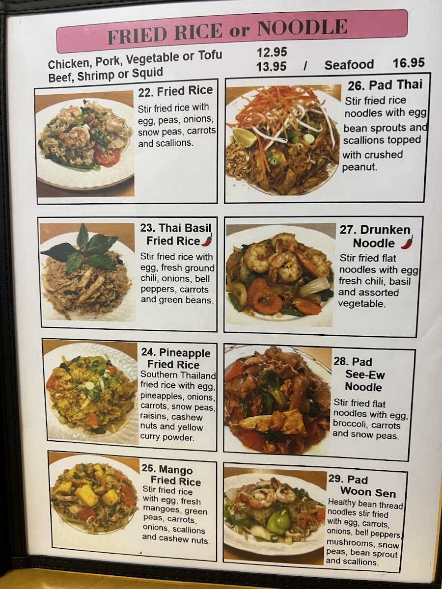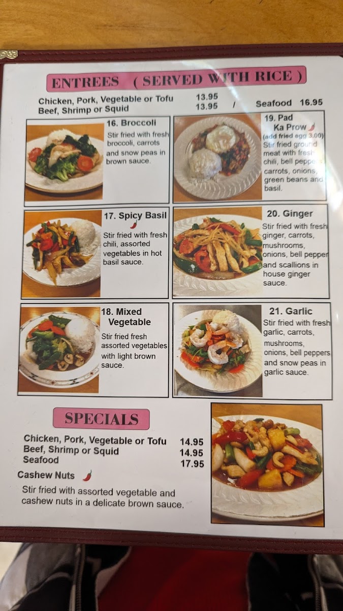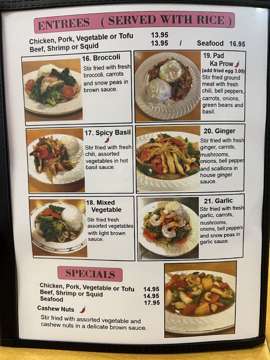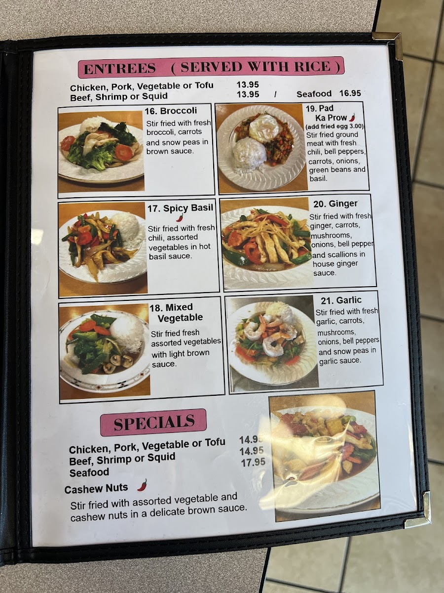 Mild. (Add fried egg for an additional charge) Stir-fried ground meat with fresh chili, bell peppers, carrots, onions, green beans and basil.