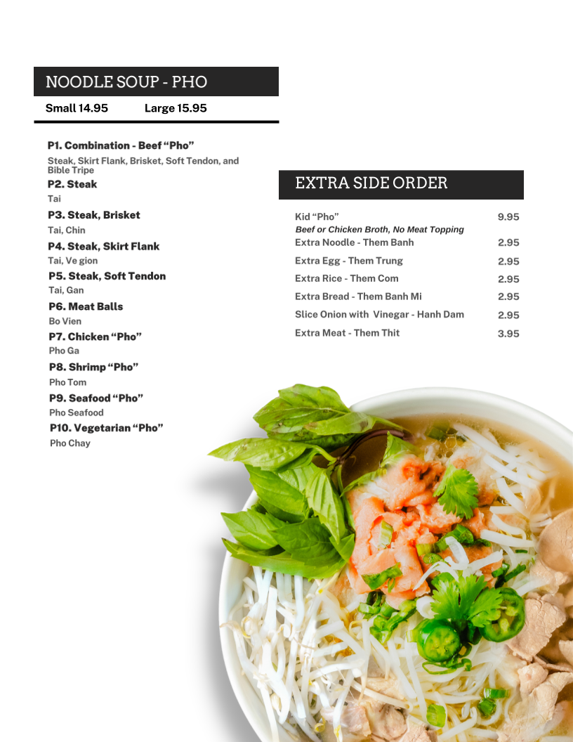 "Pho" Noodles Soup combination of Eye Round Steak, Skirt Flank, Brisket, Soft Tendon and Bible Tripe served with Beef broth