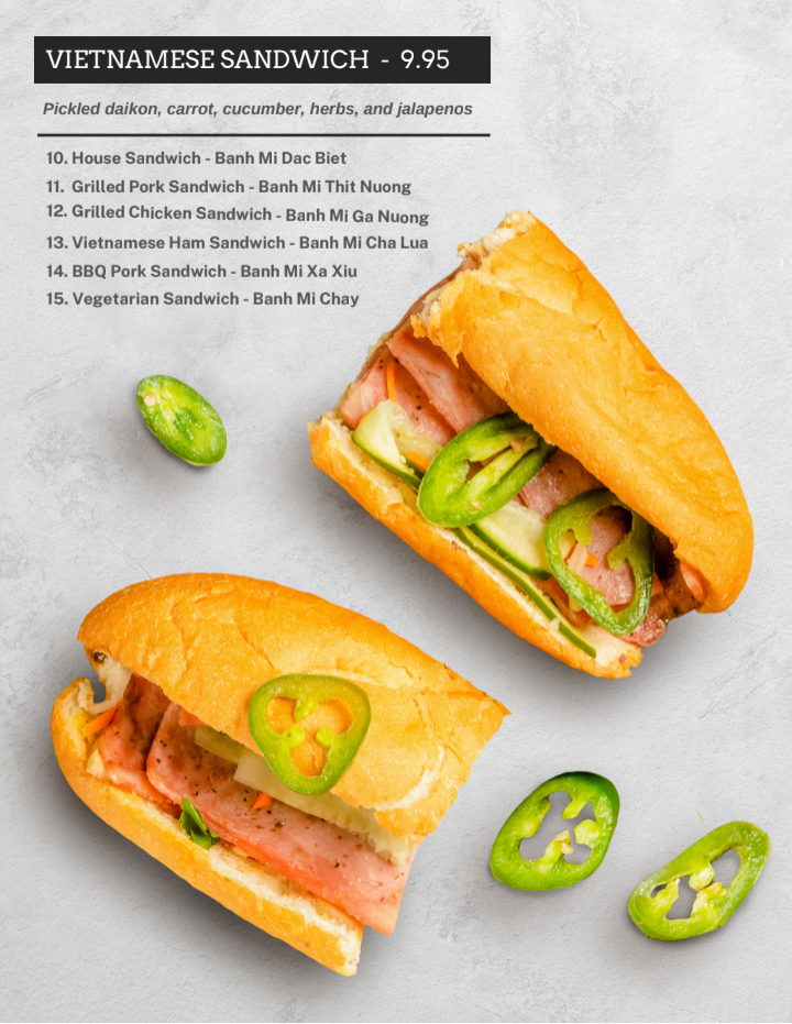 House Sandwich with special sauce served with pickled daikon, carrot, cucumber, herbs and jalapenos